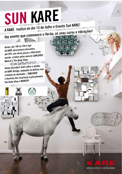 A loja de decoração KARE DESIGN, juntamente com outras marcas (Sunlover, Munich, Body Shop, Cia Marítima, entre outras) vão organizar um evento de boas vindas ao Verão, onde vão poder encontrar muitas acções, descontos e passatempos onde poderão ganhar muitos presentes!!