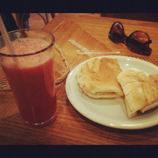 Suco de morango e melancia, pão francês na chapa com queijo minas e tomate seco